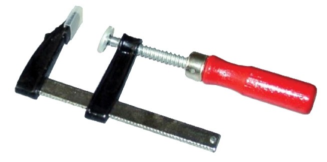 Струбцина, тип F. Деревянная ручка. В точке контакта с деталью пластиковая "пятка". Размер зева 200 мм. Длина губок 50 мм.Характеристики