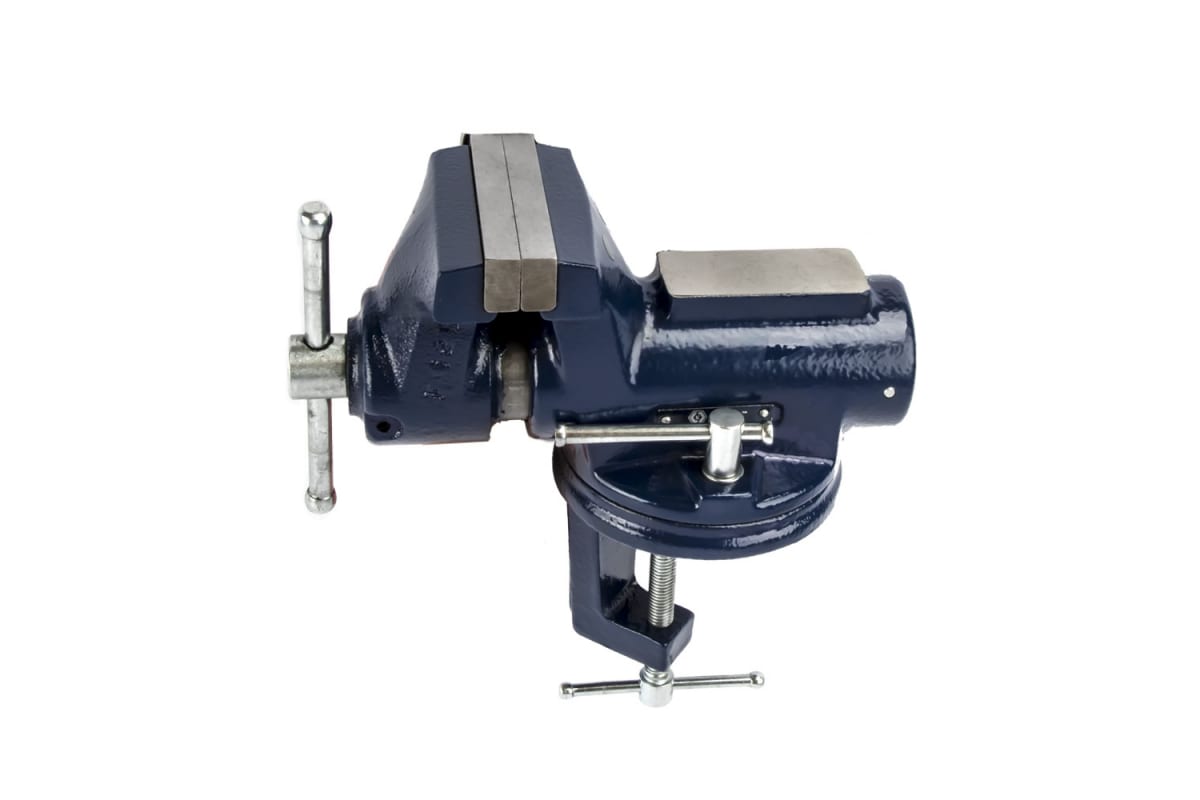 Слесарные поворотные тиски КОБАЛЬТ настольные, ширина губок 100 мм служат для надежной фиксации заготовки при проведении слесарных работ. Твердость губок - HRC 45-52. Крепление в виде струбцины дает возможность устанавливать инструмент в любом удобном месте рабочего стола. Поворотный механизм основания обеспечивает удобство при обработке детали с разных сторон.Характеристики