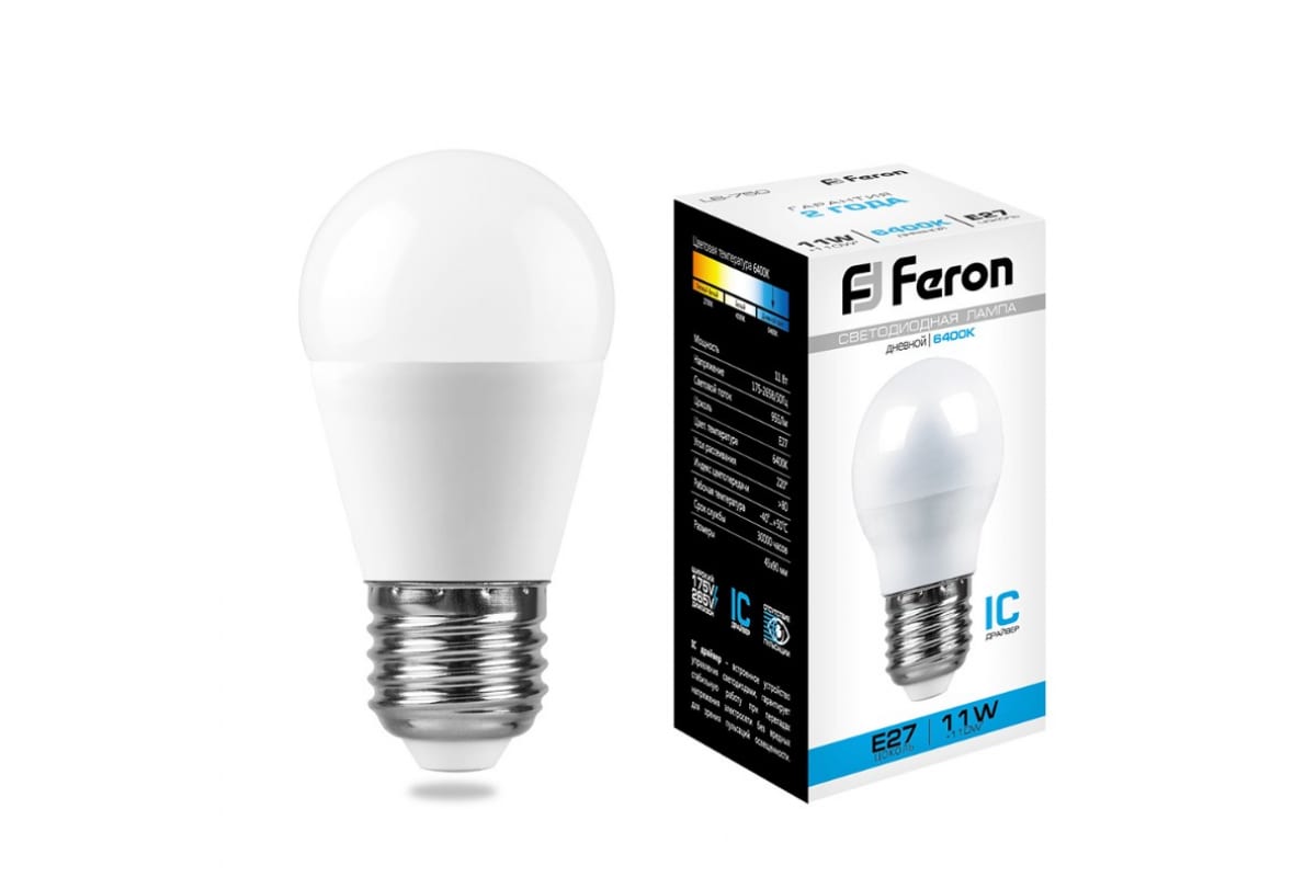 Лампа светодиодная FERON LB-750, G45 (шар), 11W 230V E27 6400К (дневной), рассеиватель матовый белый, 955Lm, угол рассеивания 220°, корпус пластик, 90*45мм Внешний вид Цвет свечения дневной Материал корпуса пластикХарактеристики