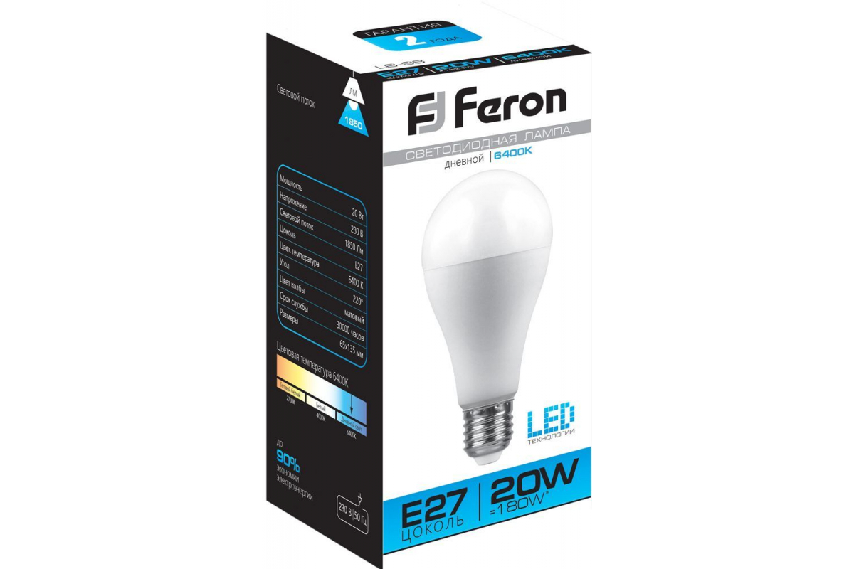 Лампа светодиодная FERON LB-98 (20W) 230V Е27 6400K A65 дневной