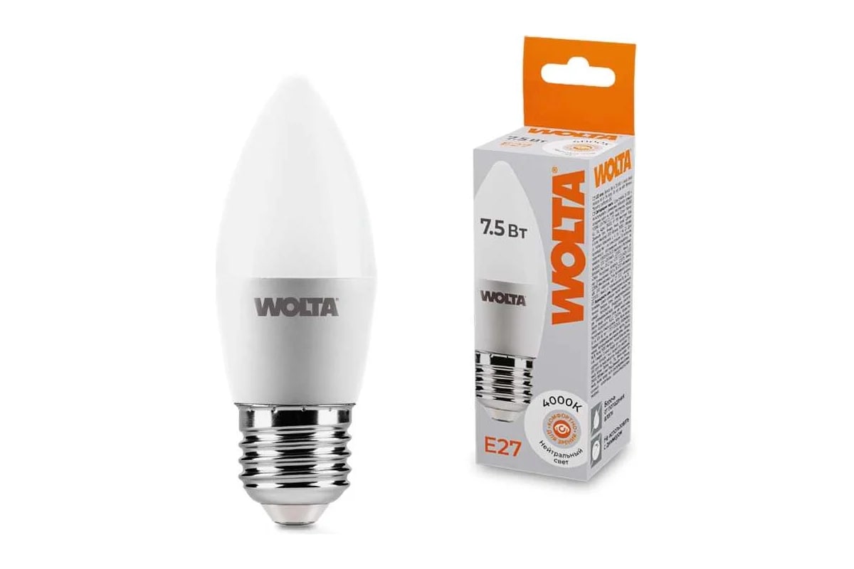Wolta Светодиодная лампа LED 25SC7.5E27 Свеча , 7.5Вт , 4000K Дневной белый свет , C37 , E27— это наилучшее техническое решение для бытового использования внутри помещений с оптимальными значениями светового потока, цветопередачи и сроком службы, что подтверждено многоуровневым контролем качества при прохождении испытаний в специализированных лабораториях для сертификации продукции.Характеристики