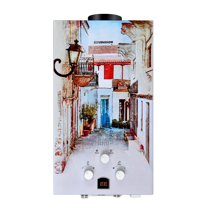 Газовый водонагреватель проточного типа EDISSON предназначен для бытового использования и выполнен с применением современных технологий. Особенностью модели является оригинальное цветовое оформление. Прибор обладает компактными габаритами и оригинальным дизайном на переднюю панель нанесен пейзаж прекрасного города Лиссабон.Характеристики