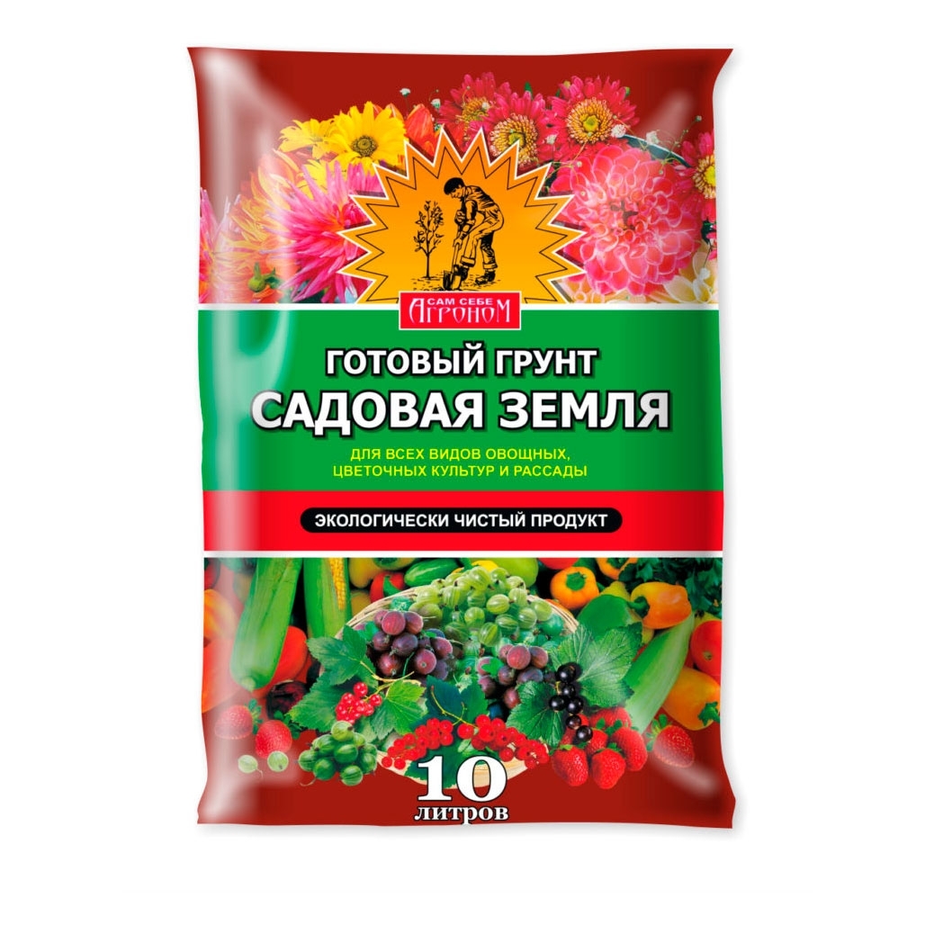 Грунт садовая земля Сам себе агроном - высококачественный натуральный грунт специального назначения на основе торфа, полностью готовый к применению и прекрасно приспособленный для проращивания семян и пикировки рассады овощных и цветочных культур. Также его используют для основной заправки почвы теплиц, парников, гряд, клумб перед высадкой рассады. Используется для подкормки овощных и цветочных культур; в качестве основного питательного и почвоулучшающего компонента при посадке ягодных кустарников и плодовых деревьев, а также как мульчирующий материал приствольных кругов.Характеристики