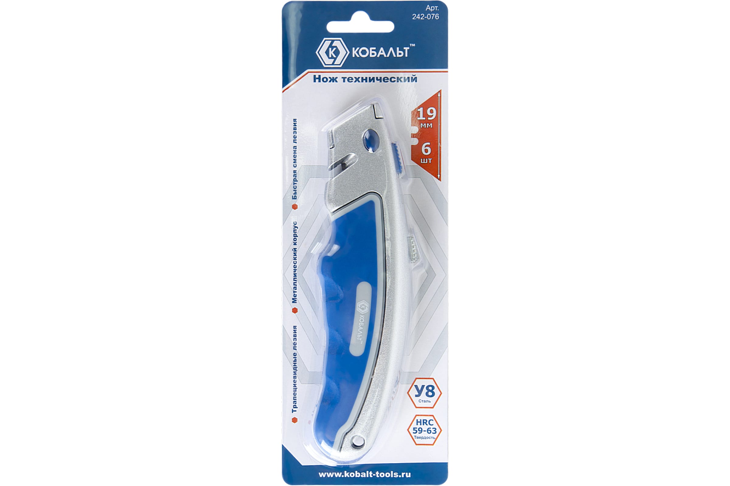 Нож технический КОБАЛЬТ трапециевидные лезвия 19 мм (6 шт.) металлический корпус, быстрая смена лезв