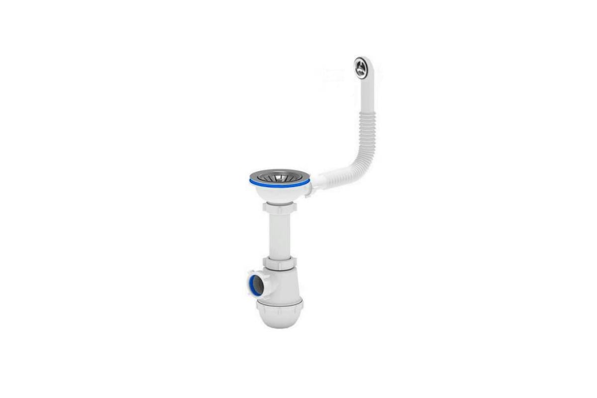 Бутылочный сифон с гибким круглым переливом для мойки из композитного материала, сливное отверстие Ø90 мм, подключение к канализации: Ø40 мм, без гибкой гофрированной трубы, длина винта сливной решётки: 40 мм, материал решётки: нержавеющая сталь.Характеристики