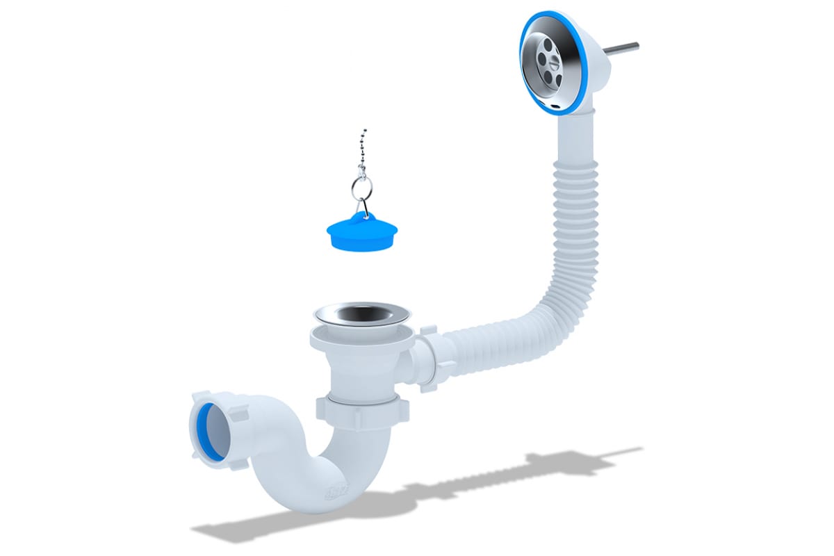 Сифон для ванны для подключения к канализации комплектуется гибкой трубой 40*50 мм.Характеристики