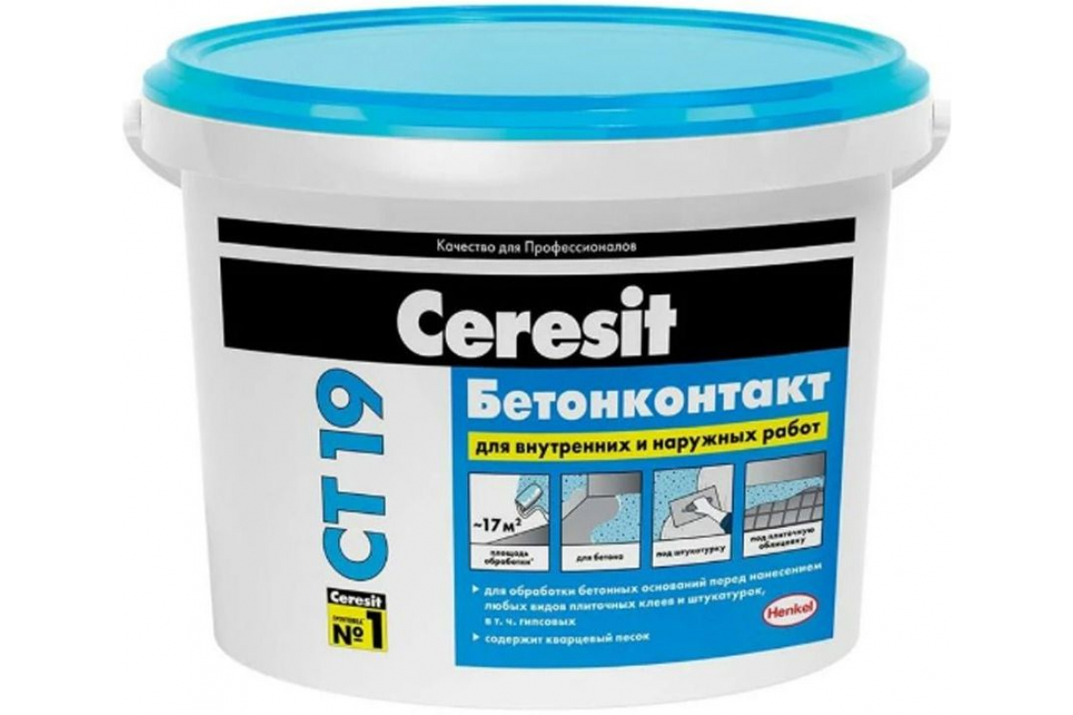 Грунтовка бетонконтакт CERESIT CT 19 5 кг подготавливает поверхности к последующему нанесению отделочных материалов. Состав используют для слабо впитывающих, хрупких и осыпающихся покрытий (кирпич, камень, бетон, цемент) внутри и снаружи помещений. Продукт повышает адгезивные свойства и облегчает нанесение выравнивающих и декоративных штукатурок, шпатлевок, клеев.Характеристики