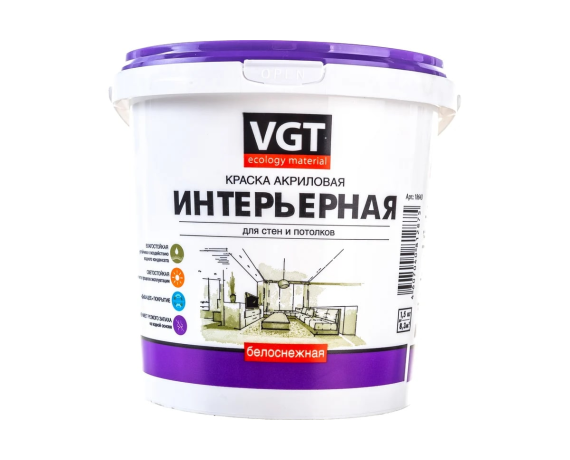 - VGT Белоснежная краска ВД-АК 2180 интерьерная влагостойка 1,5 кг 18643