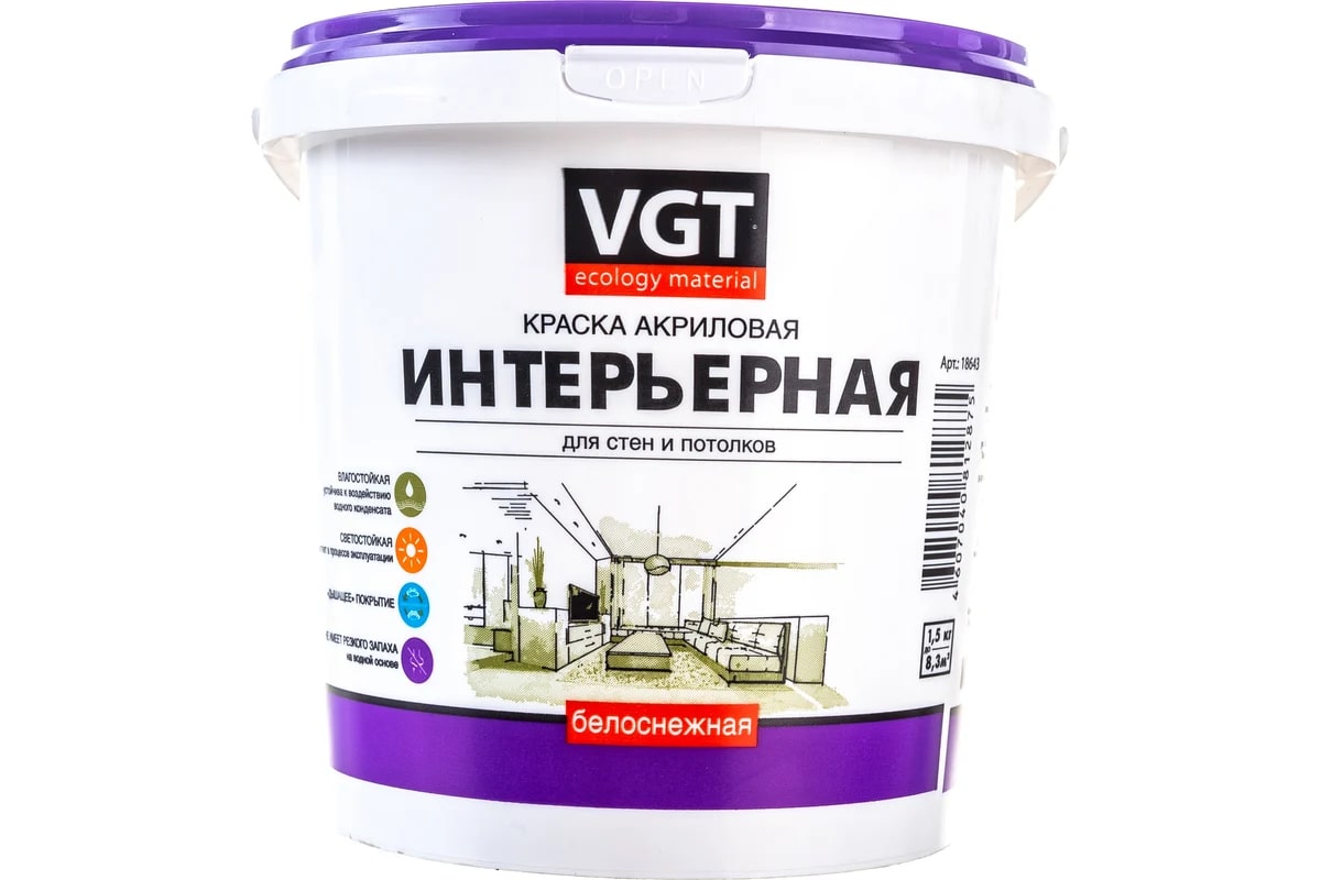 - VGT Белоснежная краска ВД-АК 2180 интерьерная влагостойка 1,5 кг 18643