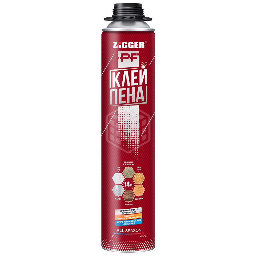 Клей-пена Zigger PF, профессиональная, всесезонная, 750 мл подходит для быстрой и прочной фиксации теплоизоляционных материалов к бетону, камню, дереву, кирпичу, металлу и битумным поверхностям снаружи и внутри помещений.Характеристики
