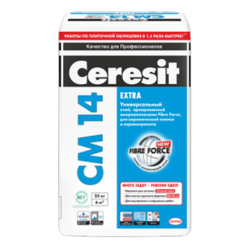 Смесь сухая строительная клеевая С1 Т Ceresit CM 14, ГОСТ Р 56387-2018. Клей CM 14 Extra предназначен для крепления всех видов керамических плиток, керамогранита, плиток из искусственного (на цементной основе) и природного (кроме мрамора) камня размером до 50х50 см - на стенах и полах, внутри (включая влажные помещения и стяжки с подогревом) и снаружи зданий. Свойства: - Обладает высокой адгезией; - Водо- и морозостойкий; - Устойчив к сползанию плитки; - Может применяться на стяжках с подогревом совместим с гидроизоляцией CR 65 и эластичной гидроизоляционной мастикой CL 51 - Пригоден для внутренних и наружных работ - Экологически безопасен Применяется на недеформирующихся бетонных и цементных основаниях, в том числе с изготовленными на них гидроизоляционными покрытиями из материалов CR 65, CR 166 и CL 51.Характеристики