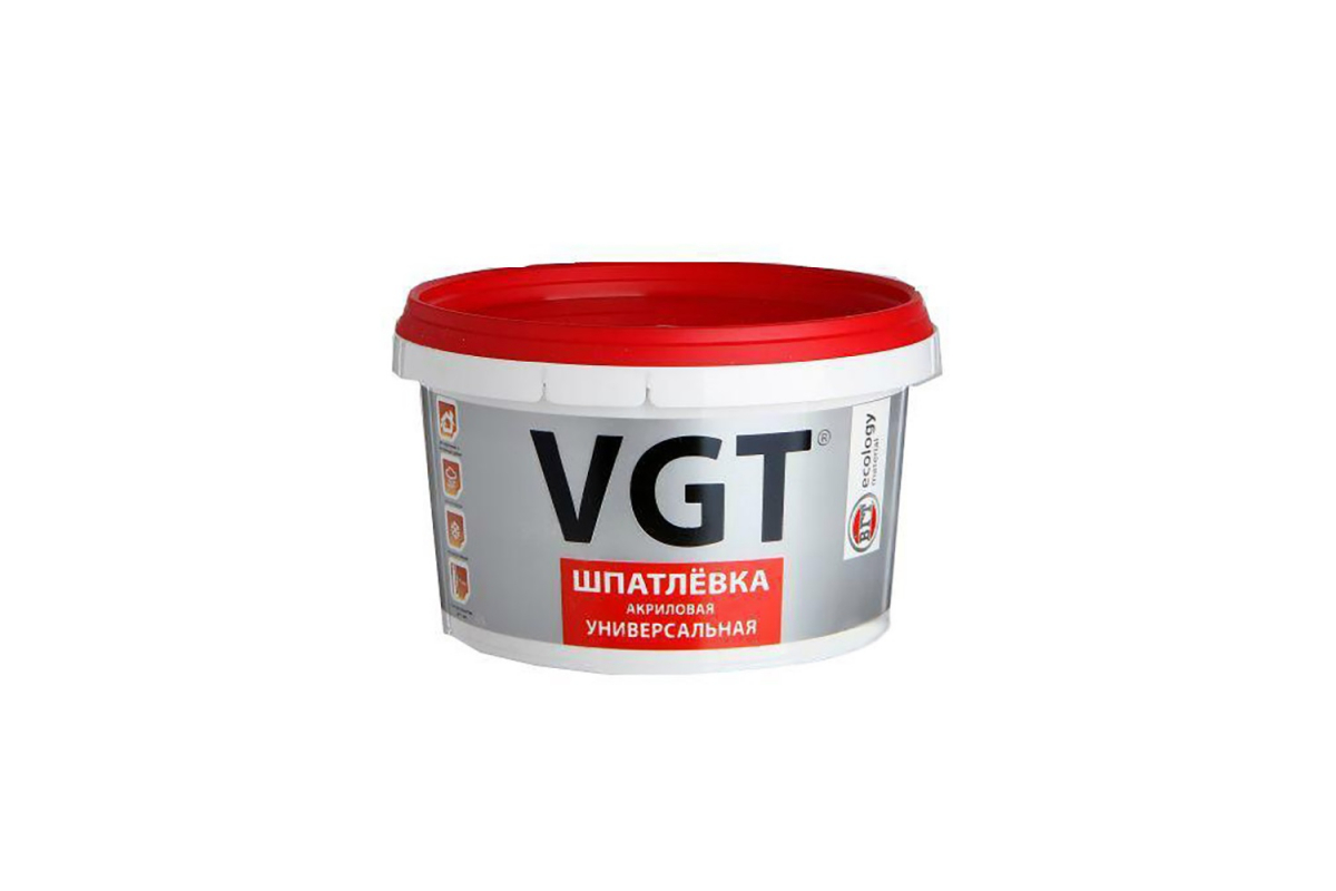 Шпатлевка акриловая наруж./внутр. ВГТ 3,6кг Служит для выравнивания, заделки неровностей, трещин и щелей глубиной до 7 мм на бетонных, кирпичных, оштукатуренных и других видах минеральных поверхностей при проведении наружных (под навесом) и внутренних работ во всех типах зданий и сооружений (А-В), в т. ч. для которых предусмотрен режим влажной дезинфекции.Характеристики
